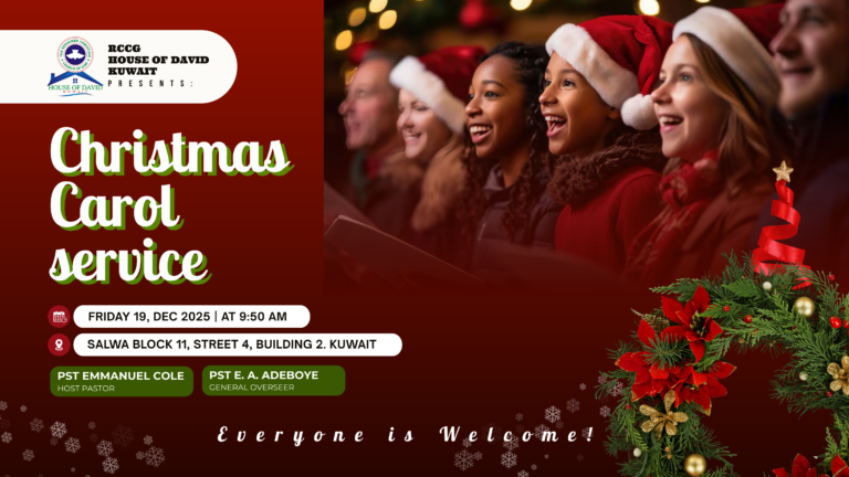 House of David Kuwait, a parish of The Redeemed Christian Church of God, is hosting a Christmas Carol Service on Friday, December 19th at 9:50 AM. The event will be held at Salwa Block 11, Street 4, Building 2, with Pastor Emmanuel Cole as the host